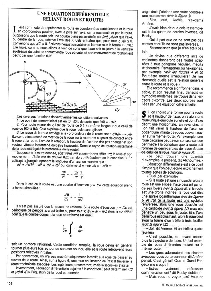 Les roues sont des courbes d'équation polaire r=cos(theta)^2 et la route une cycloïde ayant subi une affinité de rapport 1/2.